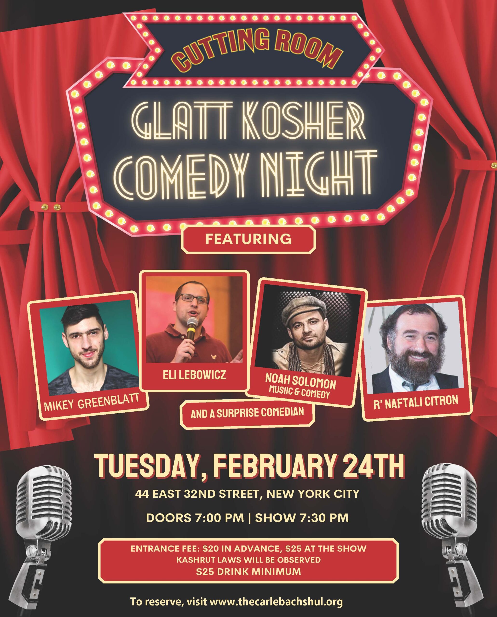 Join us on Tuesday, February 24th for a night of comedy! Performers include: Mikey Greenblatt Eli Leibowicz Noah Solomon Rabbi Naftali Citron and a Surprise Comedian! Location: The Cutting Room 44 East 32nd Street, New York NY Doors open 7:00 PM, Show 7:30 PM Price: $20 in advance, $25 day of and at the door +$25 Drink Minimum Kashrut Laws will be observed Click here to Reserve Â